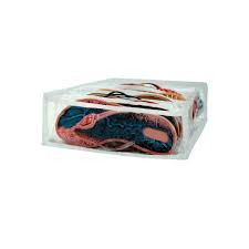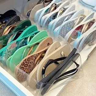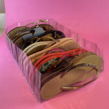 Chinelos, sapatilhas rasteirinhas e sutiãs.